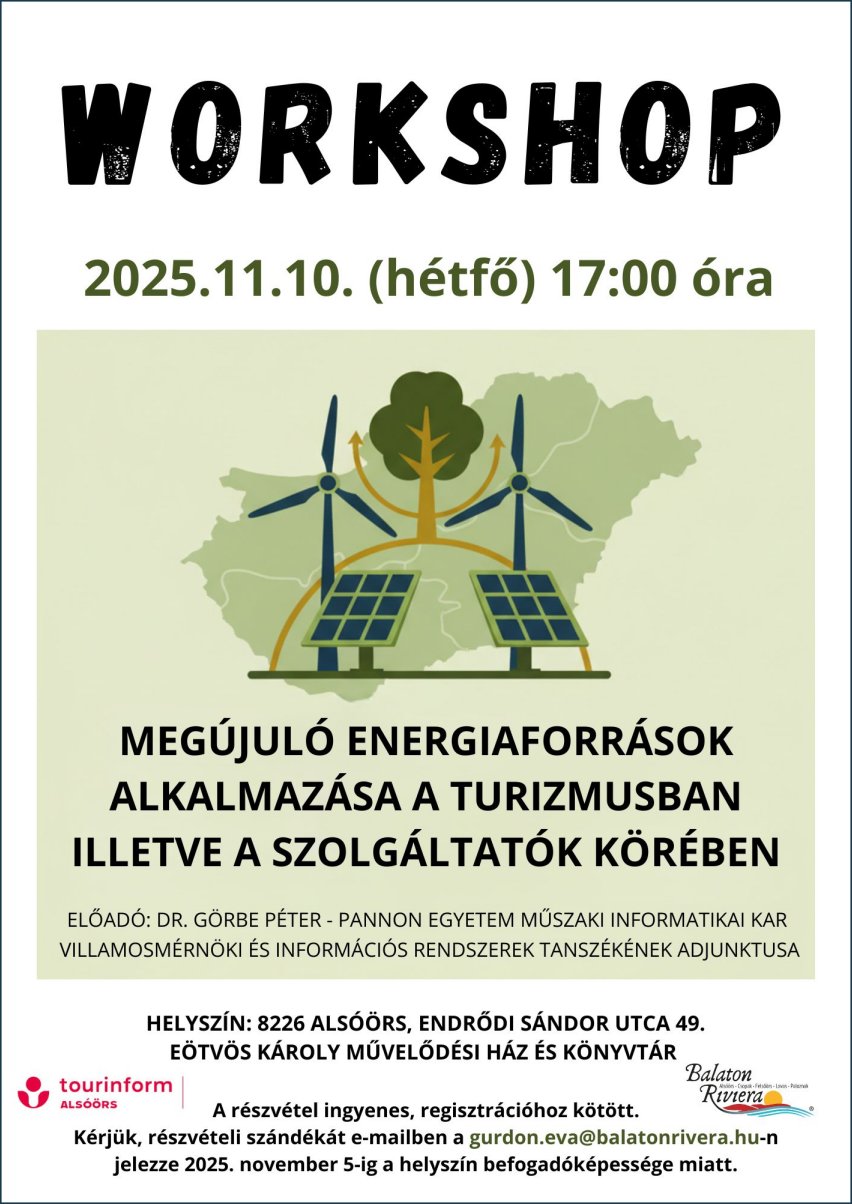 Tisztelettel várunk minden érdeklődőt szakmai workshop-unkra, melynek címe: „Megújuló energiaforrások alkalmazása a turizmusban, ill. a szolgáltatók körében„, előadó: Dr. Görbe Péter adjunktus.