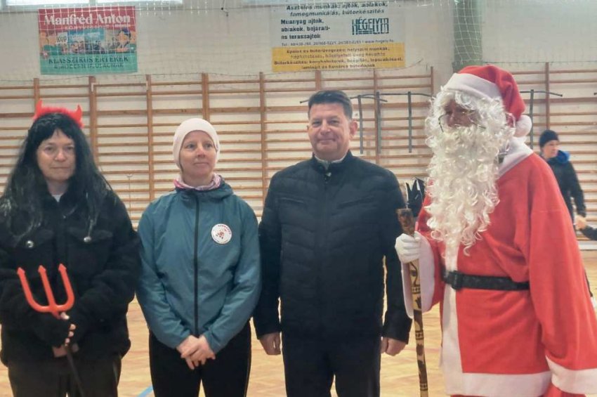 A kísérők, nézelődők népes serege végig kísérhette a korosztályok „küzdelmét”, ami igazából a táv leküzdése, önmaga megerősítése volt, hogy sikerült. Újra és újra. Az érettebb korosztályok között együtt futottak a Fürge Ujjak Klub kézimunkázói természetesen egyen pólójukkal demonstrálva az egységet, de még egy idős nagymama is lánya és veje kíséretével tett egy kört, ha nem is futva, de az élmény neki is ugyanaz. Itt mindenki nyertes volt. Visszaérve a csarnokban tea, pogácsa, gyümölcs és Mikulás csomag várt minden rajtszámmal érkezőt. Legjobban talán a Mikulástól esett volna jól a csomag, s krampusza is inkább segített volna az osztásban….. A nagy buzgalom bizony mellőzte a segítségüket, pedig végig ott várakoztak. A csomagban csokimikulás, üdítő, müzliszelet, szaloncukor és egy futóövtáska. Idei újdonság, hogy a szaloncukor egyben tombolajegyként is szolgált, hiszen ezzel a sorsolással zárult az esemény. S milyen öröm nyertesnek lenni! Még a lelátó felső sorából is villámgyorsan leért -nem is egy – ifjú nyertes a parkettára. Elfogytak a nyeremények, elszéledtek az emberek, a szervezők még összerakták a kellékeket……. s hazamentek a legények (és leányok is).
