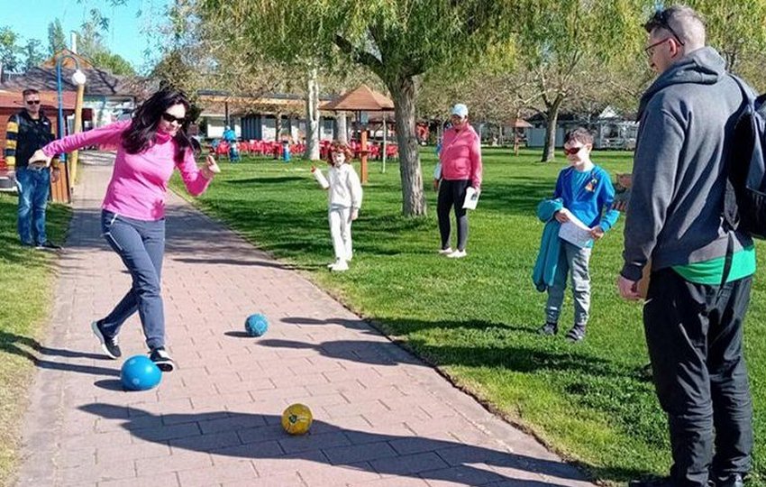 Állomásokkal tűzdelt út vezetett a Merse-parkig, ami a Riviéra irodája elől indult, ahol Timer Lilla regisztrálta és igazította útba a jelentkezőket, kb negyven lelkes és kíváncsi gyermek kaptatott felfelé az Endrődin, de csak az után, hogy a strandon teljesítették a bemelegítő feladatokat Gurdon Éva felügyeletével, azaz a zsákban ugrálást bója kerüléssel és a labdavezetést. A művelődési ház melletti füves területen Losoncziné Vass Éva várta az érkezőket az újabb feladattal, ami azért komoly koncentrálást igényelt az apró emberkéktől, kanálba helyezett (tojás helyett) pingpong labdával szaladni a megadott célig…. aki ezt teljesítette, indulhatott a következő állomásra, az óvoda melletti játszótérre, ahol nyuszifejes dobozba kellett plüss répákat dobálni három különböző távolságról, itt M.Nyírő Mária várta a gyerekeket. Az ötödik állomás a gyönyörűen feldíszített, tavaszi virágpompában ragyogó Merse-kútnál volt, ez volt a „kezdő költők ligete”. Helyet is lehetett foglalni, hogy eredményesebb legyen a töprengés, megadott szavak (húsvét, nyuszi, fiú, tojás, kölni, leány, robot, vödör) felhasználásával kellett locsolóverset költeni……. aztán következett a park, a nagy szabad tér, ahol újabb lehetőségek kínálkoztak. A pavilon alatt kézműves foglalkozás Molnárné Mile Anikóval, arcfestés Bíró Edittel. A bokrok előterében Ricsi bácsi (Vastag Richárd) gyűjtötte maga köré a gyerekeket, felnőtteket is szép számmal, s olyan csodát művelt velük, hogy az ég is kékebben fénylett felettünk. Kilégzés (kifújjuk a rosszat), belégzés (beszívjuk a jót) után ritmikus gyakorlatok közben a mosolyt is elővették képzeletbeli zsebükből a gyerekek.