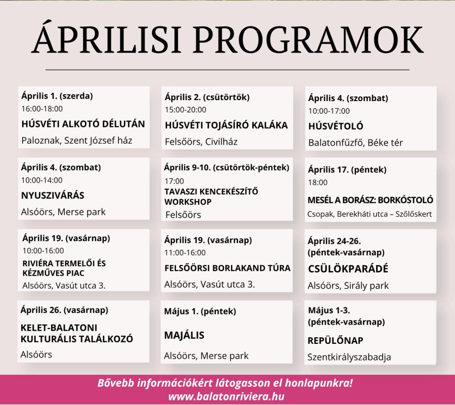 Rendezvények Riviéra áprilisi programok Istvan Posted on 3 hét ago Balaton Riviéra itt a tavasz – várjuk programjainkon áprilisban is! Alsóörs, Lovas, Paloznak és Felsőörs tavasszal is számos élményt tartogat Continue Reading Previous: Születésnapi köszöntő Kapcsolódó hírek Rendezvények Húsvéti nyusziváró Istvan Posted on 3 hét ago Rendezvények Riviéra márciusi programok Istvan Posted on 2 hét ago