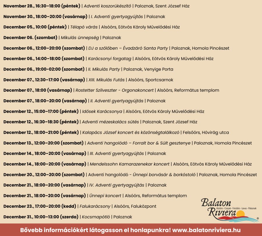 Rendezvények Riviéra Turisztikai Egyesület programjai Istvan Posted on 46 perc ago Balaton Riviéra – több, mint Balaton… decemberben is Alsóörs, Lovas, Paloznak és Felsőörs a téli hónapokban is számos élményt tartogat Continue Reading Previous: „Festőőrs” kiállítás Kapcsolódó hírek Rendezvények XIII. Mikulás futás Istvan Posted on 3 hét ago Rendezvények Adventi programok 2025. Istvan Posted on 1 hét ago Rendezvények Riviéra Turisztikai Egyesület Istvan Posted on 3 hét ago