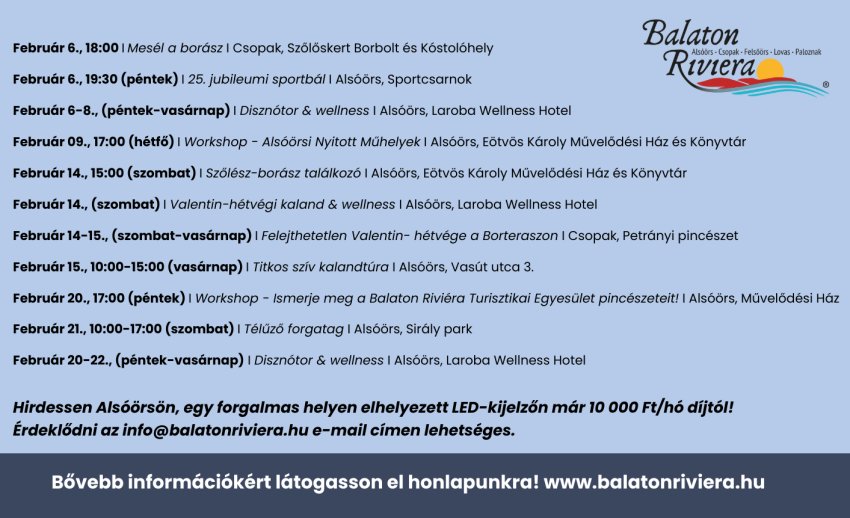 Rendezvények Balaton Riviéra februári programjai Istvan Posted on 2 hét ago Balaton Riviéra – több, mint Balaton… 2026-ban is! Alsóörs, Lovas, Paloznak és Felsőörs az év elején is számos élményt tartogat Continue Reading Previous: KT-ülés előterjesztései 2026.01.29Next: Programterv 2026. Kapcsolódó hírek Rendezvények 25. Szőlész-borász találkozó Istvan Posted on 3 hét ago Rendezvények Sportbál 2026. Istvan Posted on 2 hét ago Rendezvények Magyar kultúra napja 2026. Istvan Posted on 2 hét ago