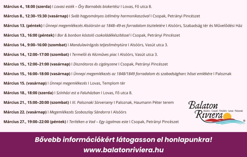 Rendezvények Riviéra márciusi programok Istvan Posted on 5 óra ago Balaton Riviéra – több, mint Balaton… márciusban is! Alsóörs, Lovas, Paloznak és Felsőörs az év elején is számos élményt tartogat Continue Reading Previous: Télűző forgatag Alsóörsön